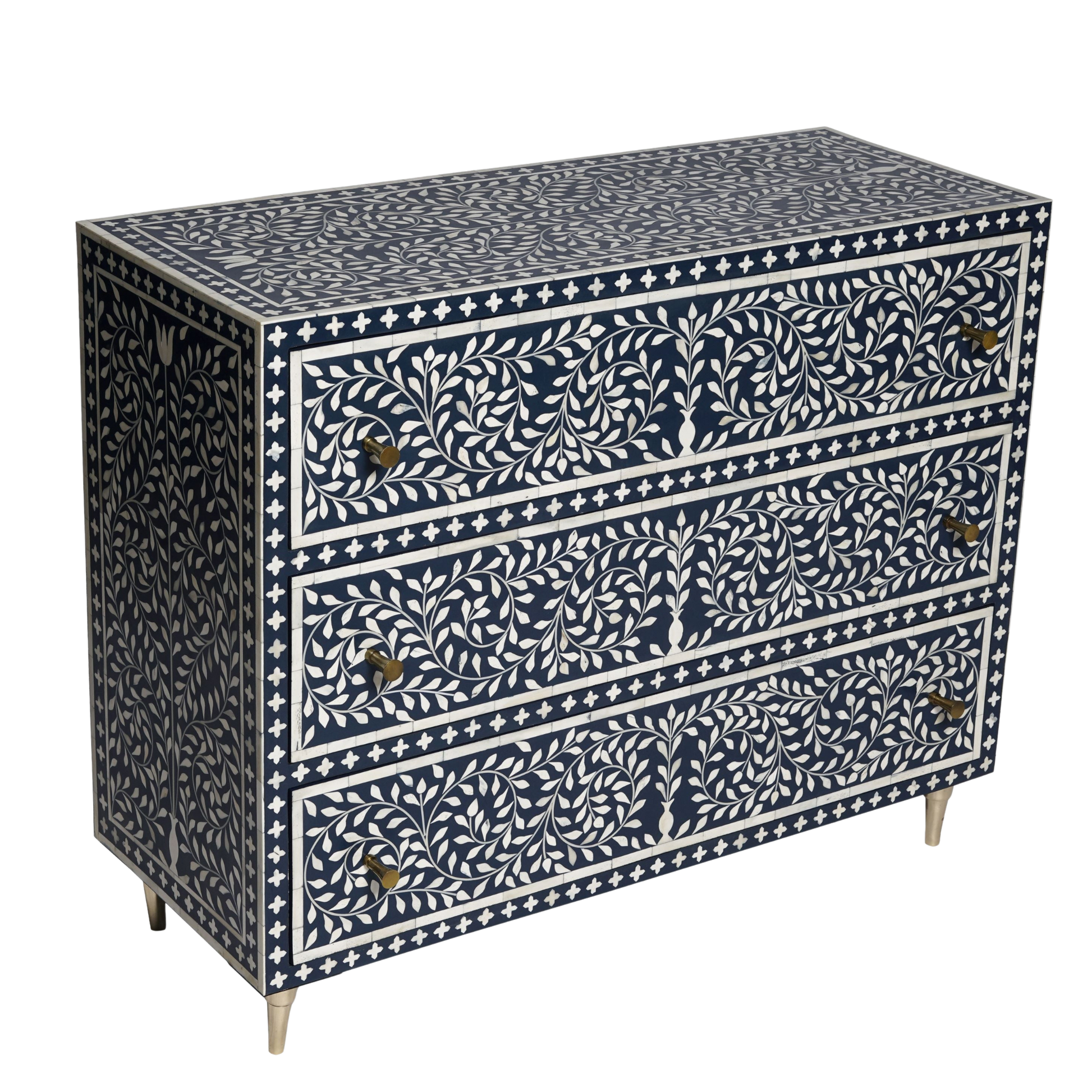 This chest of drawers boasts an intricate floral bone inlay design that is sure to impress. Use it as a striking centerpiece in your entrance or living space, or as the pièce de resistance in your bedroom. Meticulously handcrafted using ethically sourced materials, this chest of drawers is 100% ethical and designed to express your personality and style. The unique design and beautiful navy blue color create an unmatched aesthetic that is sure to make your heart and home sing.