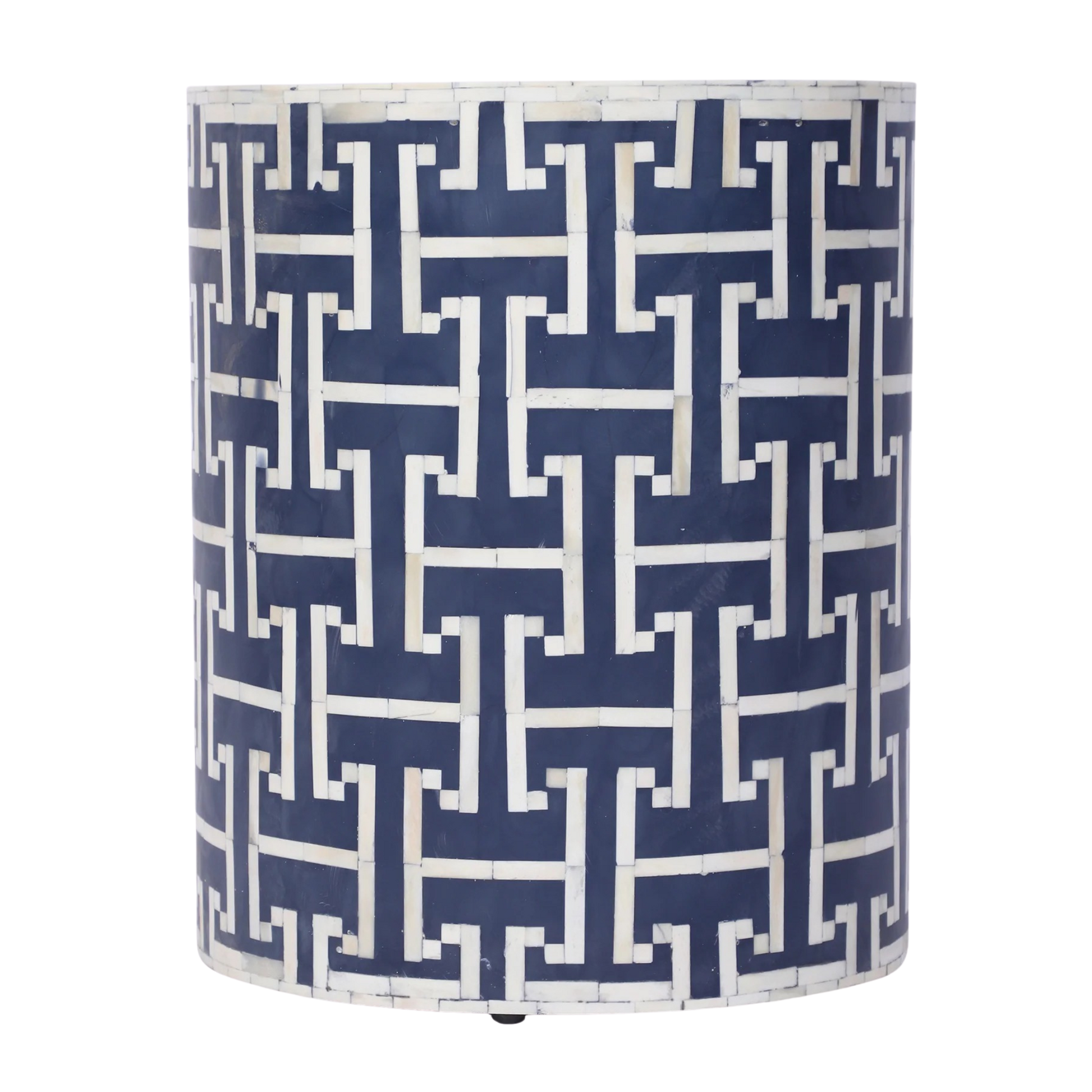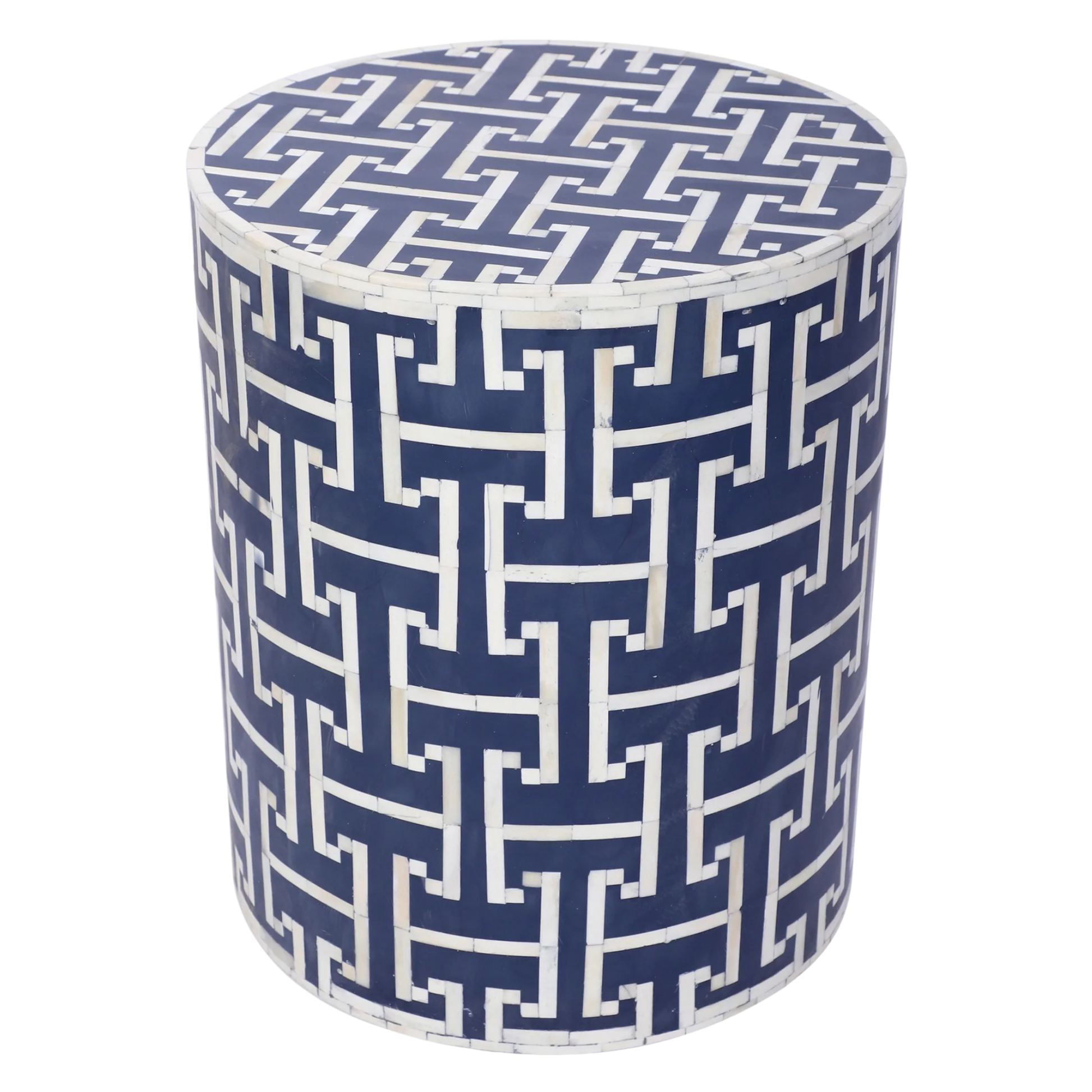 Bold and architectural, this drum side table is handcrafted in bone inlay with the iconic Greek Key pattern — a design long associated with strength and timeless elegance. Its deep navy and ivory palette creates a striking contrast, making it one of our most statement pieces. Perfect as a side table, bedside, or accent, it brings a touch of modern luxury rooted in heritage craft.